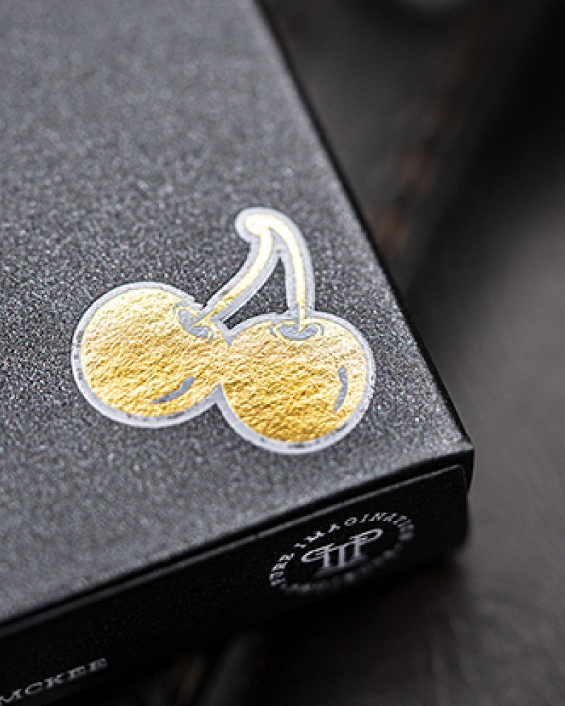 The elegant tuck case features a numbered seal and an embossed gold metallic cherry, set against a matte black background for a sophisticated look.