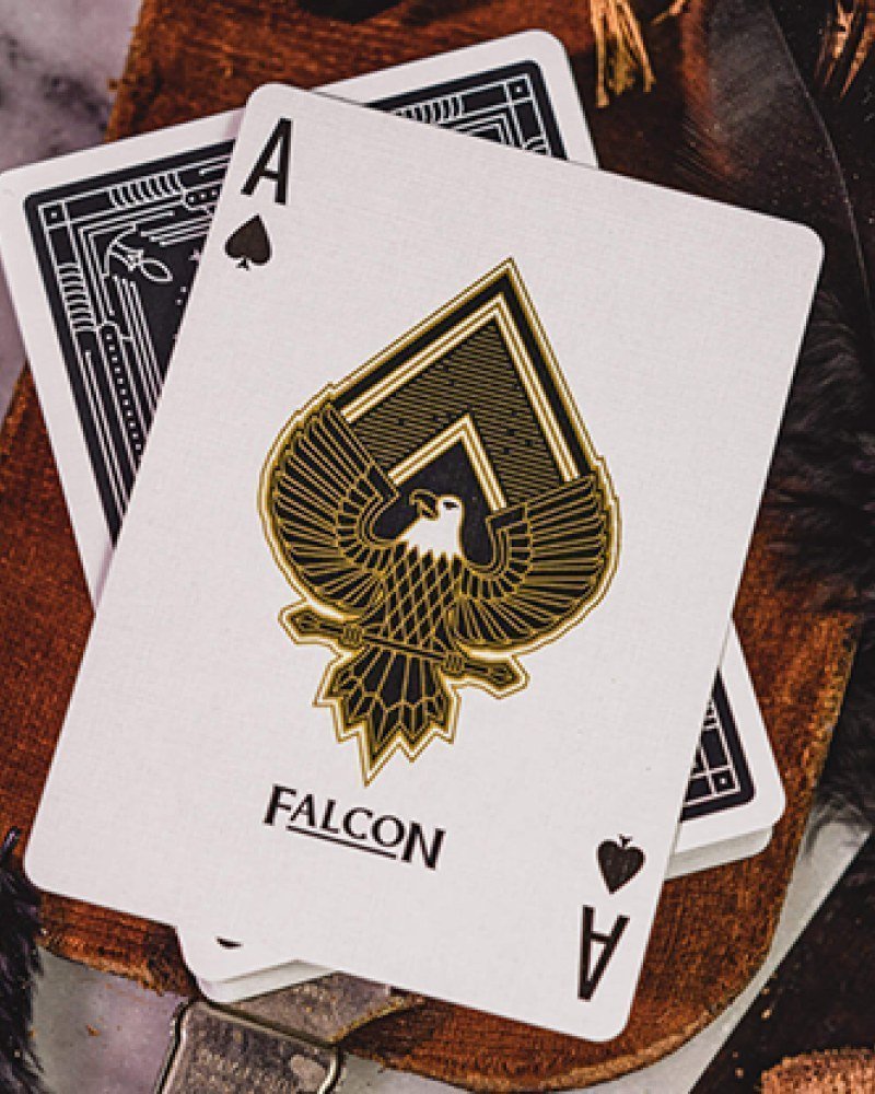 Presented in a luxurious soft-touch tuck box adorned with a gold foil Falcon logo, the deck combines traditional faces and numbers with enhanced gold metallic inks on the courts and backs for a sophisticated look.