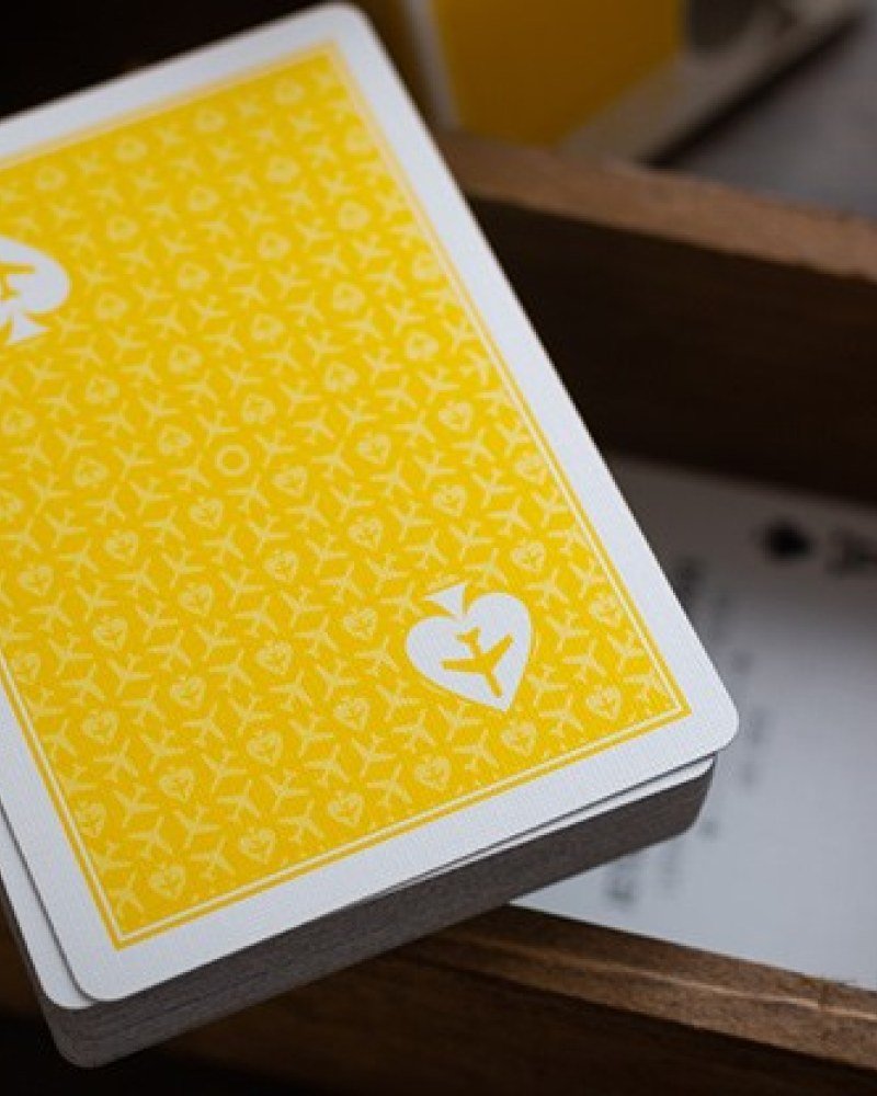 The deck features a clean and simple design inspired by casino and airline decks, with re-colored standard faces and an offset back design reflecting taxiway and runway signs in a distinctive yellow colorway.