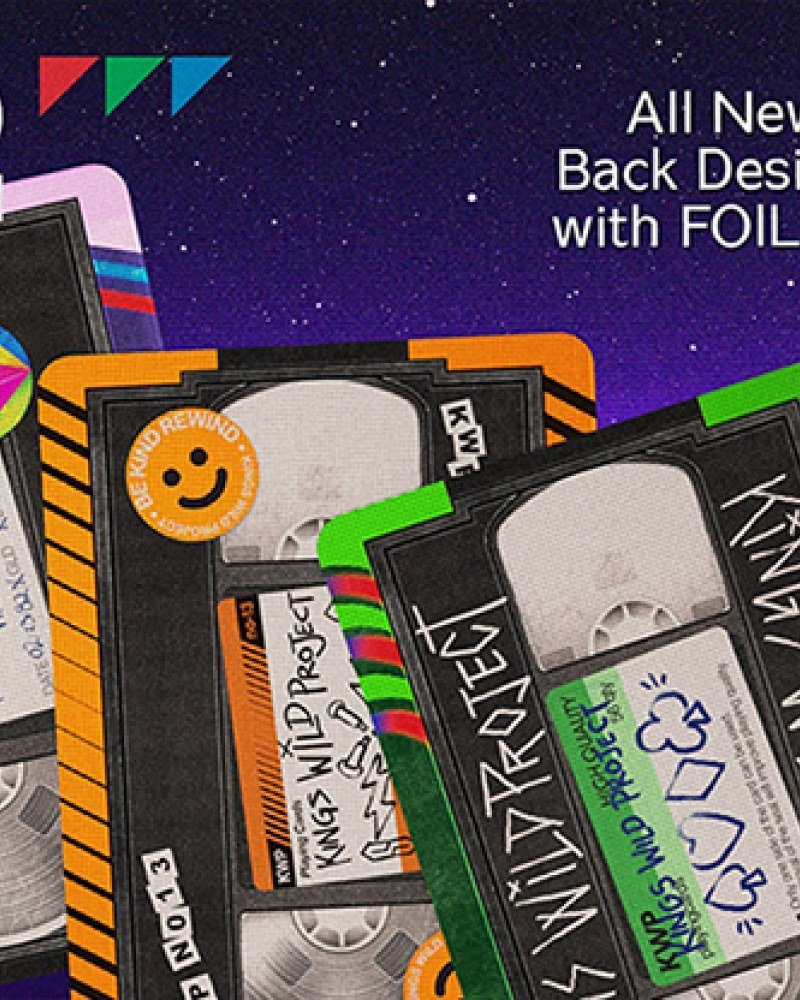 Cada mazo presenta un diseño único en el reverso con pegatinas "Be Kind Rewind!" y un degradado holográfico de rosa a azul, elevando el estilo y la sofisticación de esta baraja clásica.