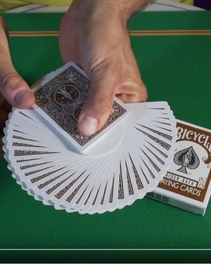 Un mazzo di carte Bicycle di alta qualità con dorso marrone distintivo, ideale per maghi e appassionati che cercano innovazione e originalità.