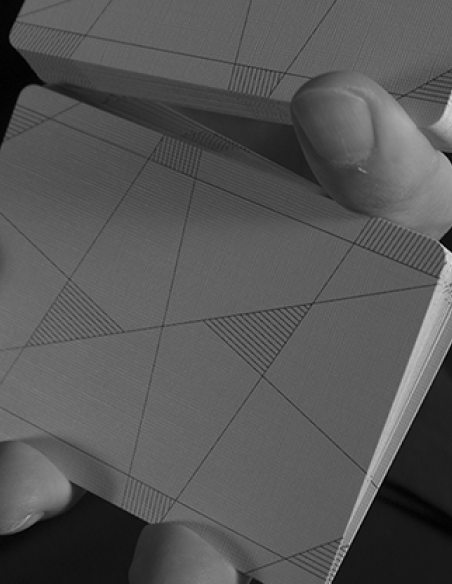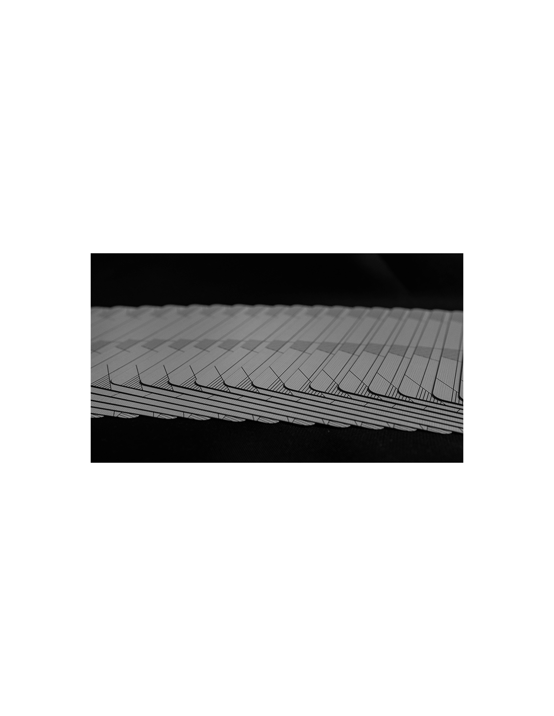 Riffle ShuffleThe name Between the Lines, implies the message that is tacit, that it cannot be seen from the outside. Value that can be recognized without being expressed. Thus, the perfect name for this deck of playing cards. The name also literally implies the space Between the Lines. The faces of cards are designed to be seen only between the lines. It's minimal but has many aspects. Consider the incredibly visual aspect of when the deck of cards is fanned or spread -- diagonal lines and partial stripes abound in amazing patterns.